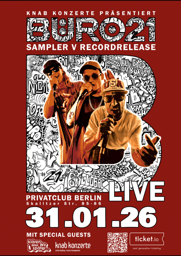 BÜRO21, bekannt aus dem Glückskecks-Philosophie Podcast „KLÄREN WIR SPÄTER“, kommen mit echtem Knaller in den Privatclub: der offiziellen Recordrelease-Show ihres neuen SAMPLER V – V steht für 5 (fünf).